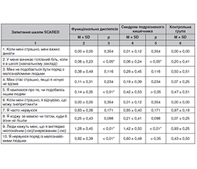 Background. Contemporary pediatric practice witnesses an increasing prevalence of comorbid functional gastrointestinal disorders and anxiety disorders in children, particularly in the context of prolonged stress during martial law. The lack of standardized Ukrainian-language tools for pediatric anxiety screening significantly complicates timely diagnosis and comprehensive care provision. This study represents the first step toward addressing this challenge in Ukraine through cross-cultural adaptation and comprehensive psychometric validation of the SCARED-C (Screen for Child Anxiety Related Emotional Disorders — Child Version). The implementation of this validated instrument will enable effective screening for anxiety disorders in children with functional gastrointestinal disorders. The purpose was to investigate anxiety disorders in children with functional gastrointestinal disorders accompanied by abdominal pain under martial law conditions through the development, cross-cultural adaptation, assessment of psychometric properties (reliability and validity) of the Ukrainian-language version of the SCARED-C screening tool, followed by its clinical implementation. Materials and methods. The study included 176 patients aged 6 to 17 years with functional gastrointestinal disorders. All of them underwent clinical evaluation comprising comprehensive health assessment with detailed history taking, physical examination, and anxiety disorder screening using the validated Ukrainian version of the SCARED-C. Results. The Ukrainian adaptation of the SCARED-C exhibited robust psychometric cha­racteristics (Cronbach’s α = 0.7; intraclass correlation coefficient = 0.973, p < 0.01), supporting its validity for anxiety screening. Children with functional gastrointestinal disorders and abdominal pain scored significantly higher on total anxiety measures, particularly on the panic disorder (p < 0.01) and somatic symptoms (p < 0.01) subscales, compared to controls. Notably, symptoms with visceral correlates (abdominal pain, nausea, and palpitations) were prominently elevated. Of clinical relevance, patients with irritable bowel syndrome scored higher on generalized anxiety disorder metrics (p < 0.01), highlighting the importance of tailored diagnostic evaluation in this subgroup. The obtained data substantiate the feasibility of using the adapted SCARED-C in clinical practice for the early detection of anxiety disorders in children with the specified pathology. Conclusions. The study results confirm the efficacy of the adapted Ukrainian version of the SCARED-C scale as a standardized screening tool for anxiety disorders in children with functional gastrointestinal disorders. This instrument enables optimization of diagnostic algorithms and a differentiated approach to managing patients with comorbid conditions.