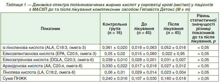 Відповідно до отриманих даних виявлено, що середній вміст загальних ПНЖК до лікування становив (0,107 ± 0,030) мкг/мл, що було нижчим за середнє значення контрольної групи умовно здорових осіб (0,240 ± 0,016) мкг/мл. Після курсу лікування комплексним засобом Гепавіста Детокс спостерігалось статистичне підвищення концентрації суми ПНЖК у 1,5 раза до (0,160 ± 0,018) мкг/мл (p < 0,05).