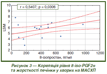 Як видно, простежено кореляцію між 8-iso-PGF2α у сироватці крові та показником жорсткості LSM (r = 0,54), яку подано на рис. 3.