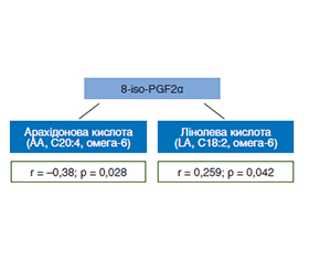 3. За результатами кореляційного аналізу встановлено вірогідний зворотний зв’язок між рівнем 8-iso-PGF2α та вмістом арахідонової кислоти у сироватці крові (r = –0,33; p = 0,028), що вказує на специфічне перетворення омега-6 ПНЖК у неферментативному ізопростаногенезі.